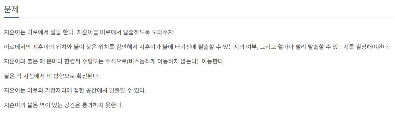만약 지훈이가 이동하려는 칸까지 가는 시간이 불이 그 칸까지 가는 시간보다 오래 걸린다면