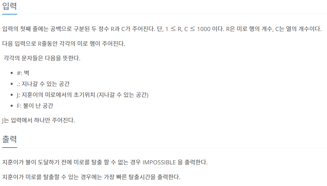 불의 경로와 지훈이의 경로를 각각 체크하며 각 칸에 도달하는데 걸리는 시간을 구한다.