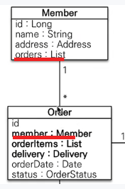 - 일대다, 다대다의 경우: 객체는 변경포인트가 두군데이지만, 테이블에서는 Foreign Key만 바꾸면 되므로, 둘 중 하나를 주인으로 정해야한다. 연관관계 주인. Orders나 Member중 Foreign Key가 가까운 것을 주인으로 정한다.