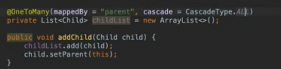 다른데도 child랑 연관관계 있으면 쓰면 안된다. 소유자가 하나일때 사용하기! 하나에서 손댔다가 다른데도 사라지면 큰일난다.