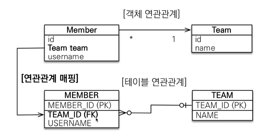 - 테이블은 외래 키 하나로 두 테이블이 연관관계를 맺음