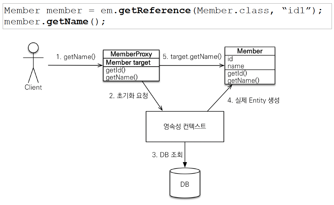 member.getName(); 을 호출하면 멤버에 값이 없어서 영속성 컨텍스트에 값 요청 -> 디비를 조회해서 실제 멤버 객체 가져온다. 즉 실제 엔티티를 생성한다. 타겟 있는걸 진짜 객체를 연결해줌.