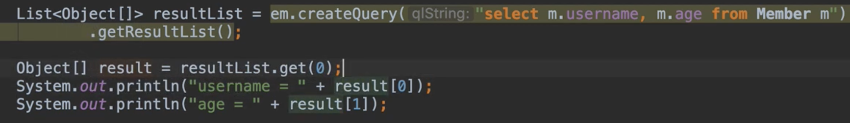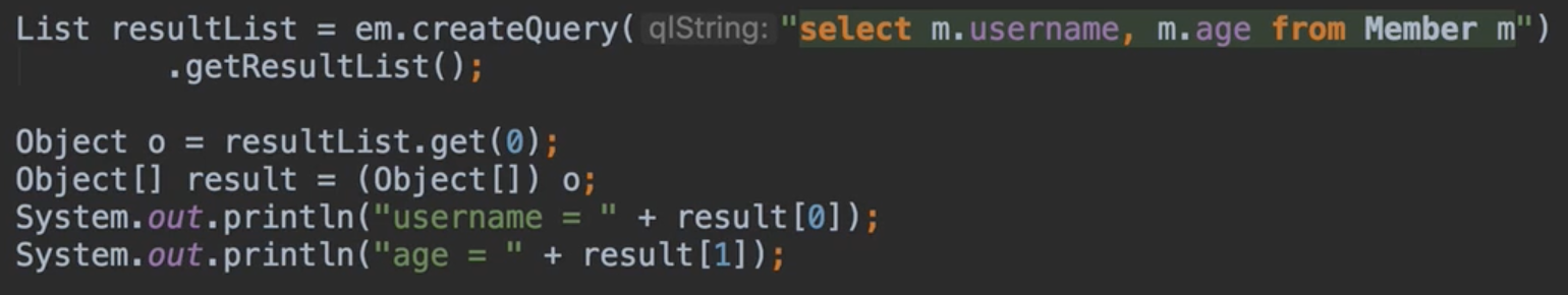 - SELECT m.username, m.age FROM Member m -> 스칼라 타입 프로젝션