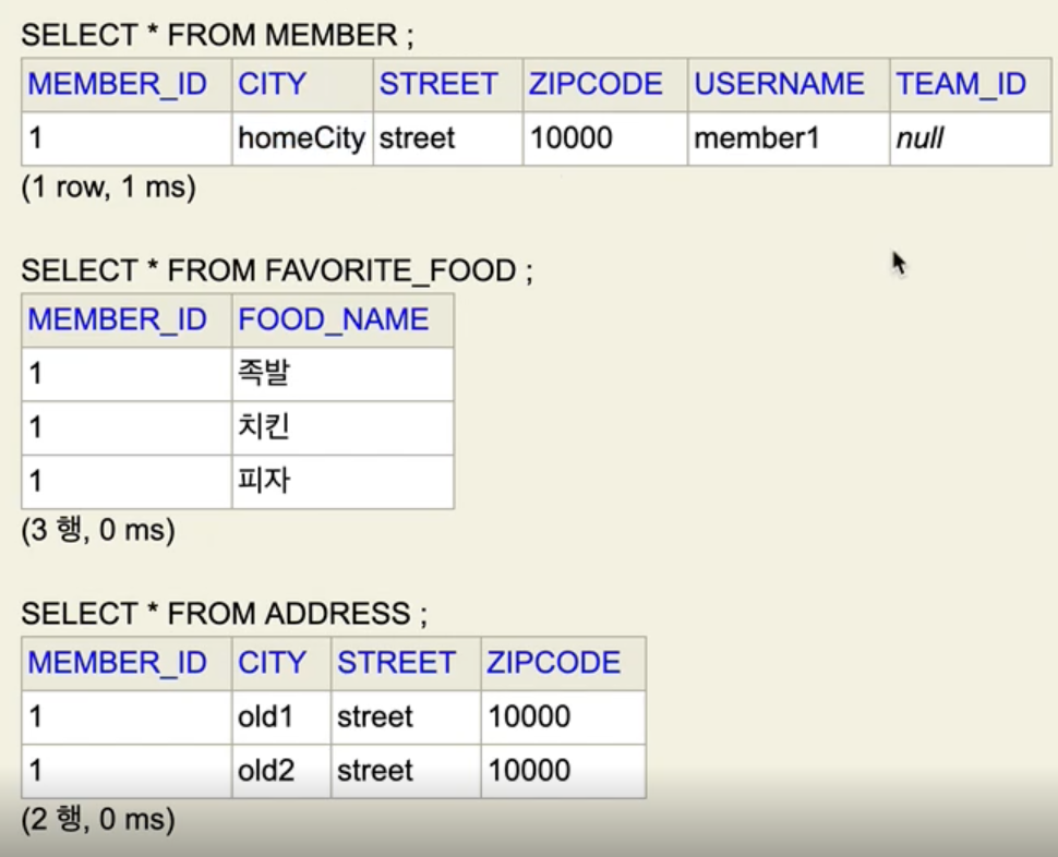 - 한 엔티티에서 같은 값 타입을 사용하면? 컬럼 명이 중복됨