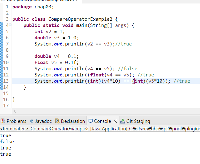 - 0.1==0.1f (false) -> 0.1f는 부동 소수점 타입이라 0.1 정확히 표현 불가. 0.100000001~ 이런 값이 되어 0.1보다 큰값이다.