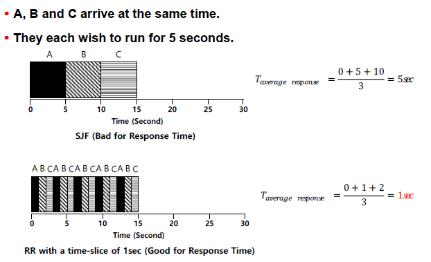 - 응답시간을 빠르게 하기 위한 방식! T(response) = T(first run) - T(arrival)