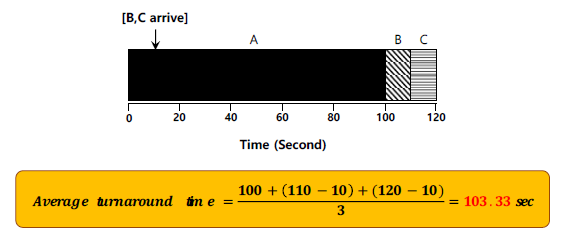 - cpu 를 오래 쓰는 프로그램이 먼저 도착해서 cpu를 잡아버리면 짧은 프로그램이라도,기다려야함