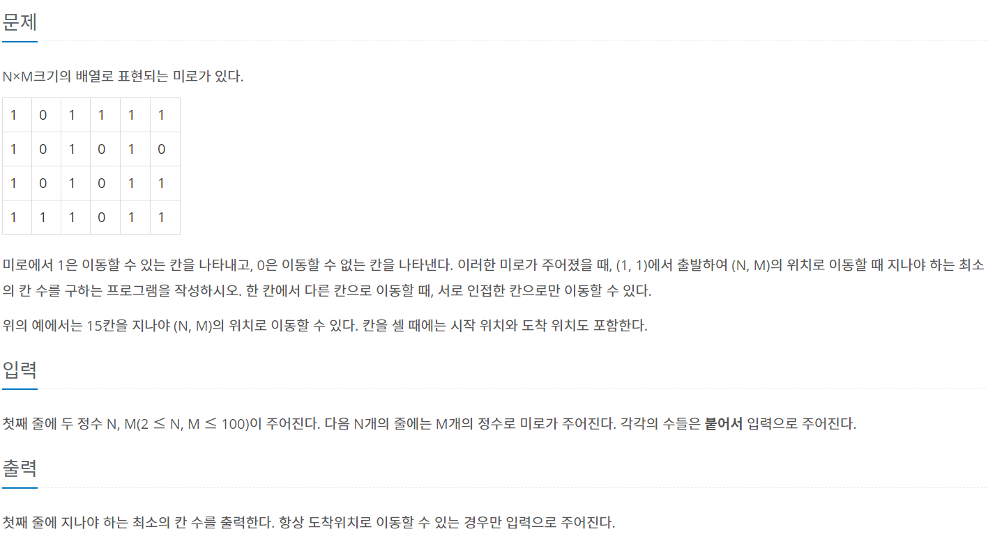 첫째 줄에 두 정수 N, M(2 ≤ N, M ≤ 100)이 주어진다. 다음 N개의 줄에는 M개의 정수로 미로가 주어진다. 각각의 수들은 붙어서 입력으로 주어진다.