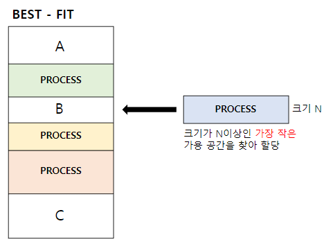 - 크기가 n이상인 가장 작은 가용공간 찾아 새로운 프로그램 할당. → 공간적 측면에서 효율적