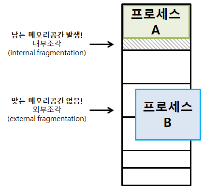 - 하나의 분할 공간에는 하나의 프로세스만 들어갈 수 있으므로 다른 프로그램 들어갈 수 없다 → 메모리 낭비